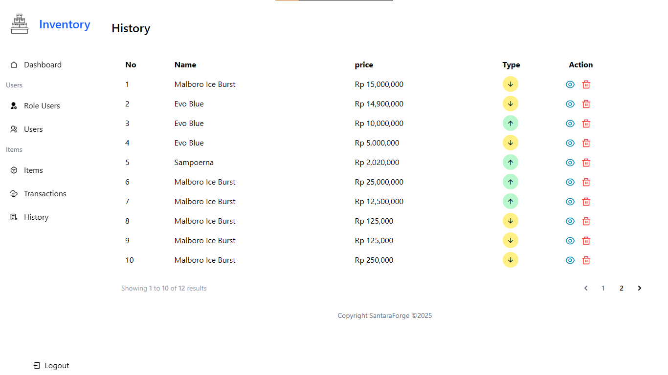 Halaman History berfungsi untuk menampilkan seluruh riwayat transaksi barang yang telah dilakukan dalam sistem, baik transaksi barang masuk (in) maupun barang keluar (out). Data pada halaman ini disusun dalam bentuk tabel yang informatif, mencakup beberapa kolom penting seperti No, Name (nama barang), Price (total harga transaksi), Type (jenis transaksi), serta Action untuk melihat detail atau menghapus data.