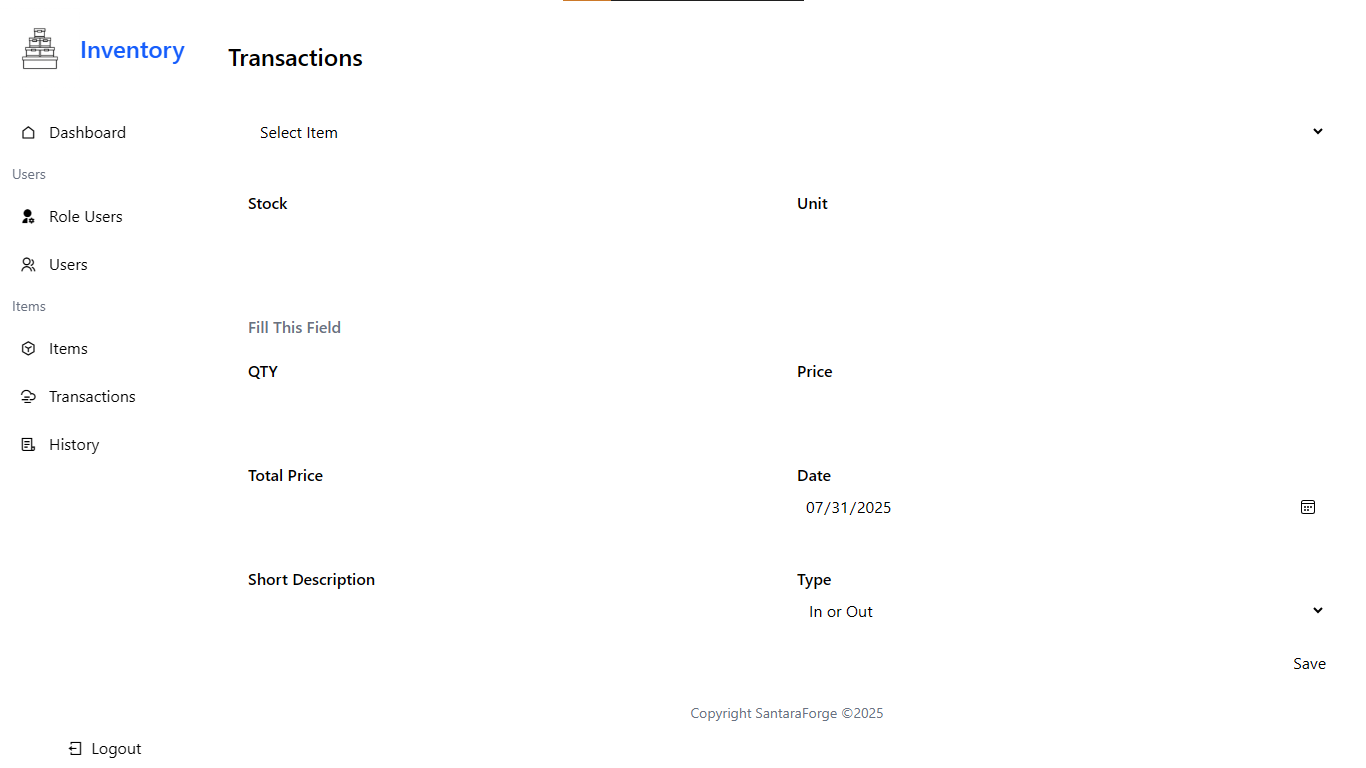 Halaman Transactions merupakan bagian penting dalam sistem manajemen inventaris yang berfungsi untuk mencatat dan mengelola setiap aktivitas transaksi barang, baik barang masuk (In) maupun barang keluar (Out). Halaman ini berisikan form input transaksi yang dirancang agar pengguna dapat mengisi data dengan mudah dan terstruktur.