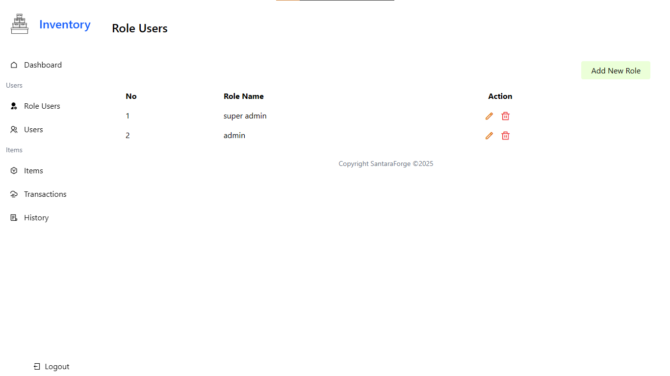 Navigasi utama terletak di sisi kiri, meliputi menu: Dashboard, Role Users, Users, Items, Transactions, dan History, yang menunjukkan bahwa sistem ini mendukung manajemen pengguna berbasis peran, pencatatan barang, pencatatan transaksi, serta pelacakan riwayat aktivitas. Fitur logout tersedia di bagian bawah sidebar untuk kemudahan keluar dari sistem.