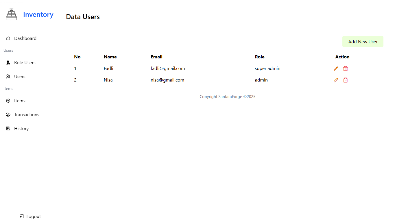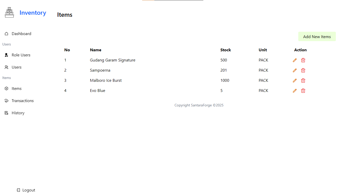 Selain itu, halaman ini menyediakan kolom Action yang memudahkan pengguna untuk melakukan tindakan pengelolaan data, yaitu mengedit item dengan ikon pensil dan menghapus item dengan ikon tempat sampah. Di bagian kanan atas, terdapat tombol Add New Items yang berfungsi untuk menambahkan barang baru ke dalam sistem. Fitur ini sangat membantu dalam proses pembaruan data stok dan pengelolaan inventaris secara dinamis. Dengan antarmuka yang sederhana dan fungsional, halaman ini dirancang untuk meningkatkan efisiensi pengelolaan barang serta memastikan seluruh data inventaris dapat diakses dan dikelola dengan mudah oleh pengguna yang memiliki hak akses.
