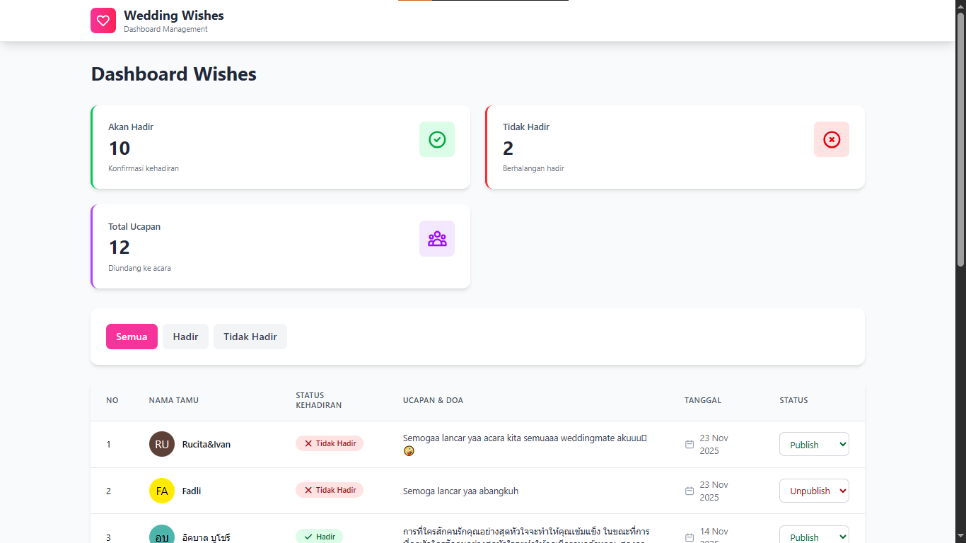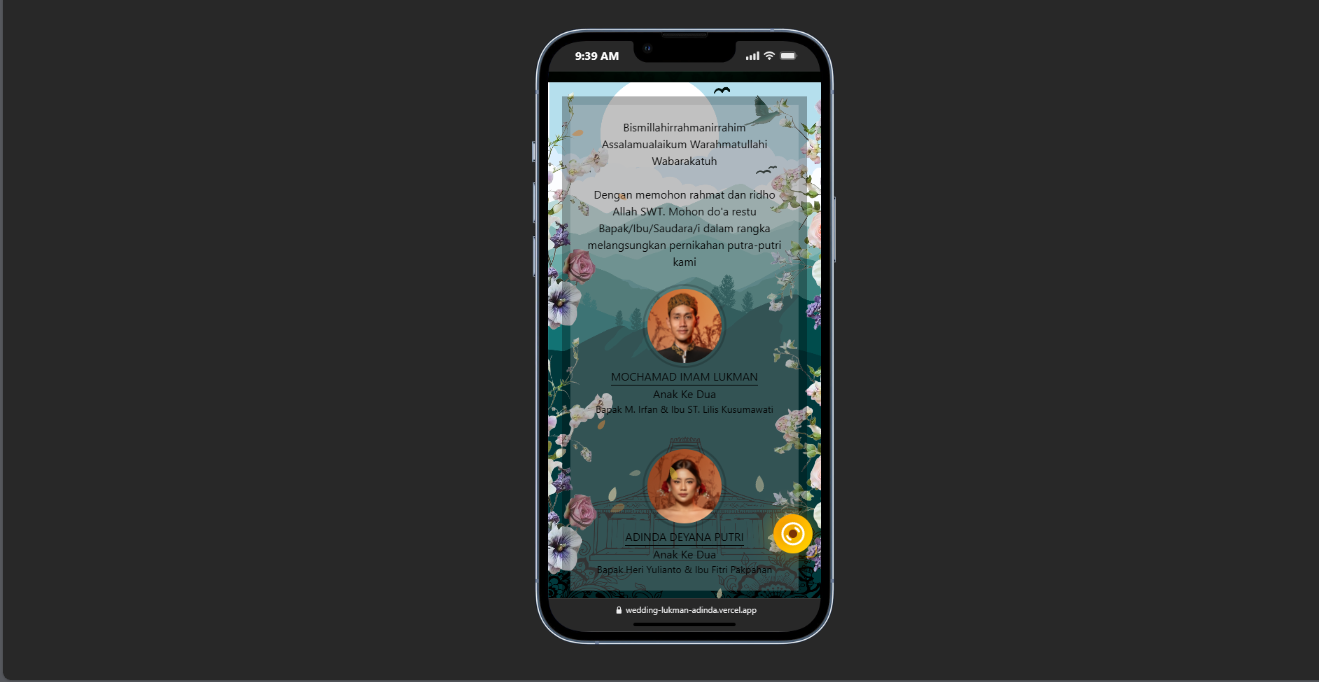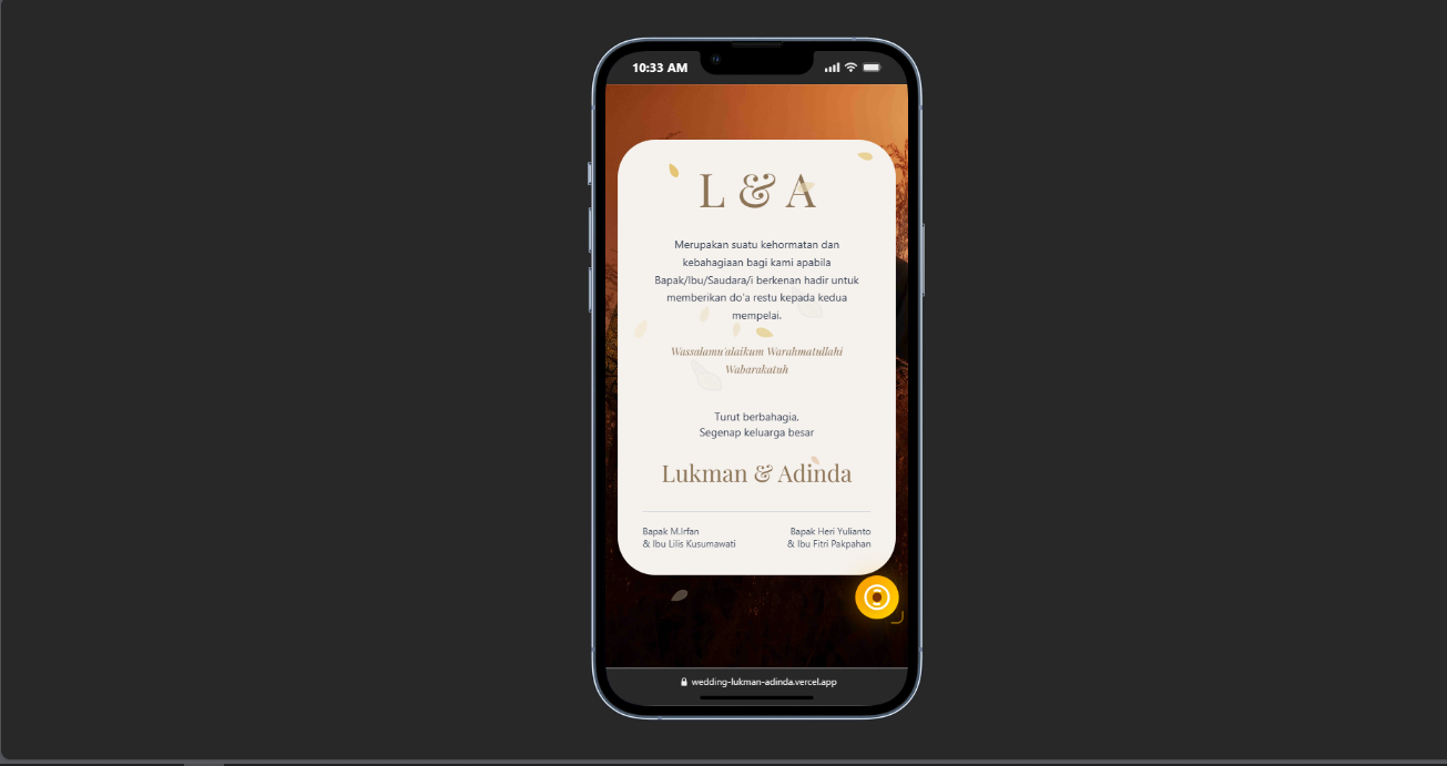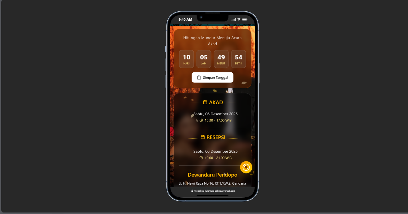 Dengan tampilan yang sederhana, website ini membantu memastikan setiap tamu mendapatkan pengalaman yang baik dan informasi yang lengkap mengenai acara pernikahan.